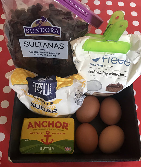 - Measure out your ingredients and put them in the mixing bowl (except the sultanas which are optional).